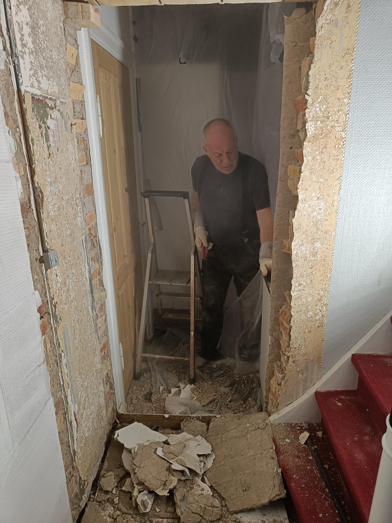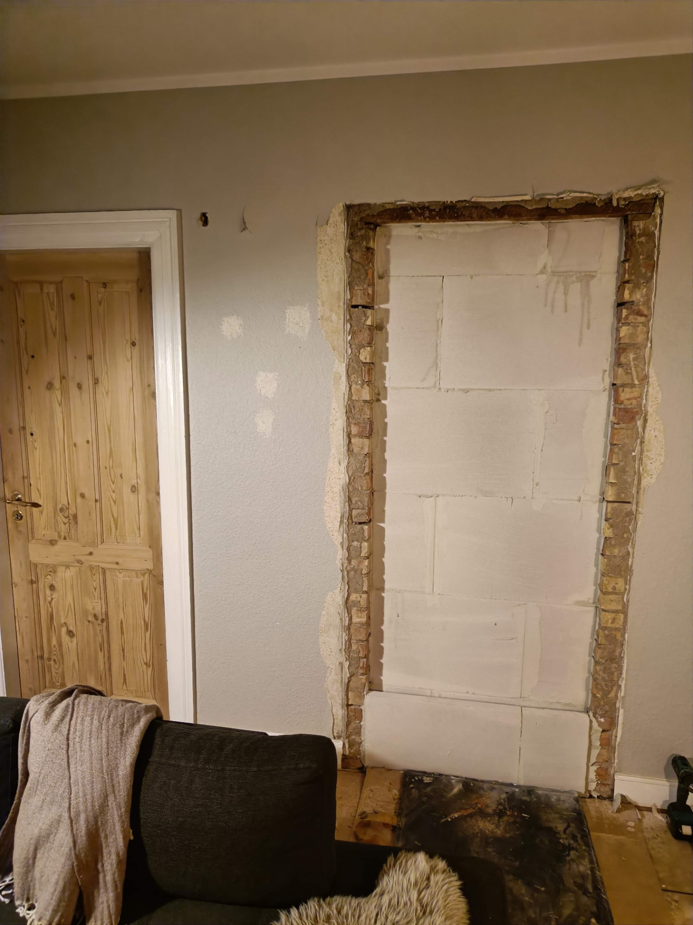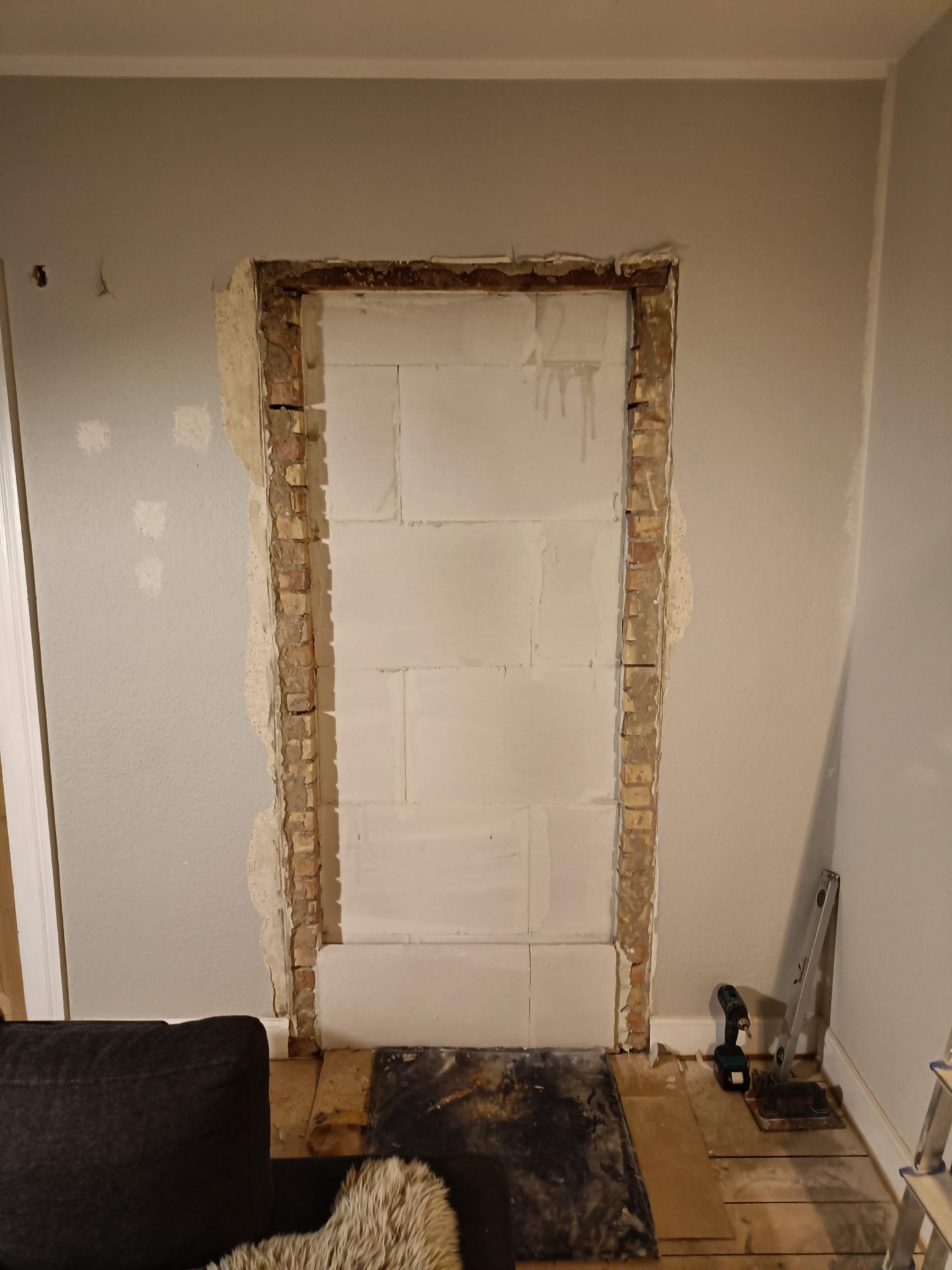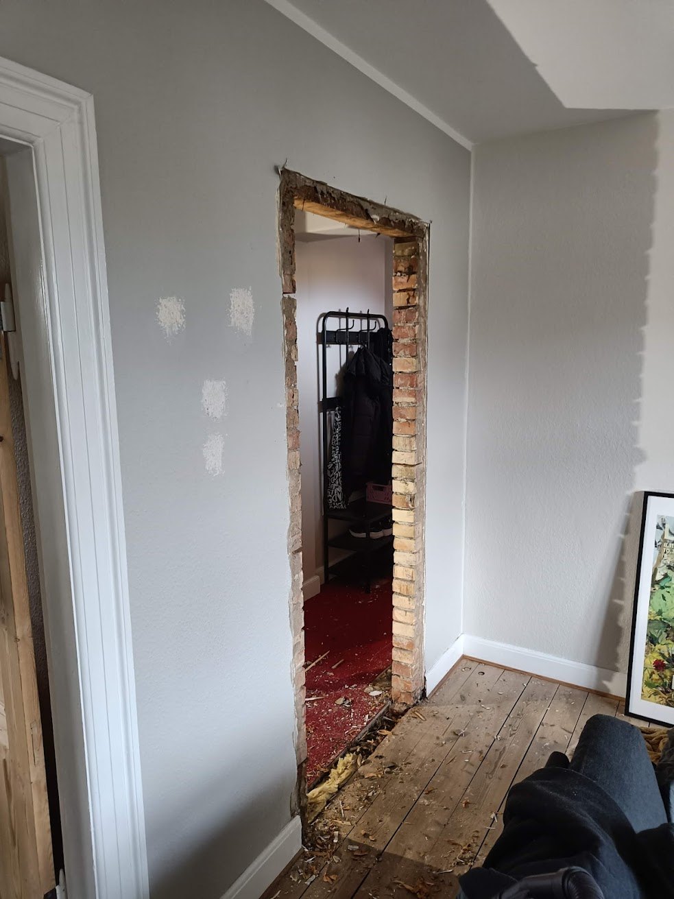 Da vi købte huset gik man igennem entreen og kom direkte ind i sofastuen, vi valgte at mure døren op her og åbne ind til køkkenet i stedet for. Vi fik sat gasbeton op og sammen med Frank og hans kammerat fik vi muret den op, og sat ståltegl over åbningen til køkkenet.