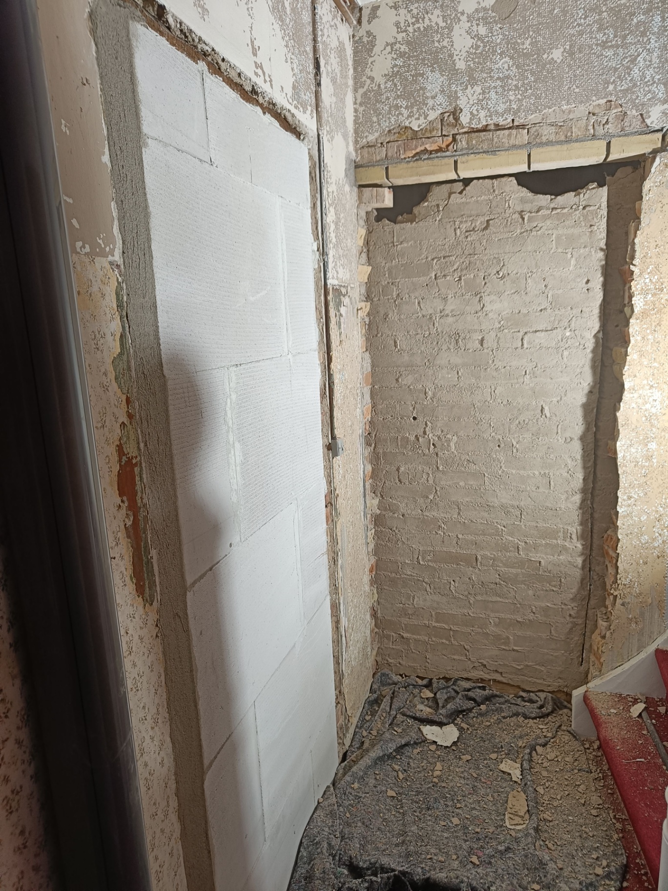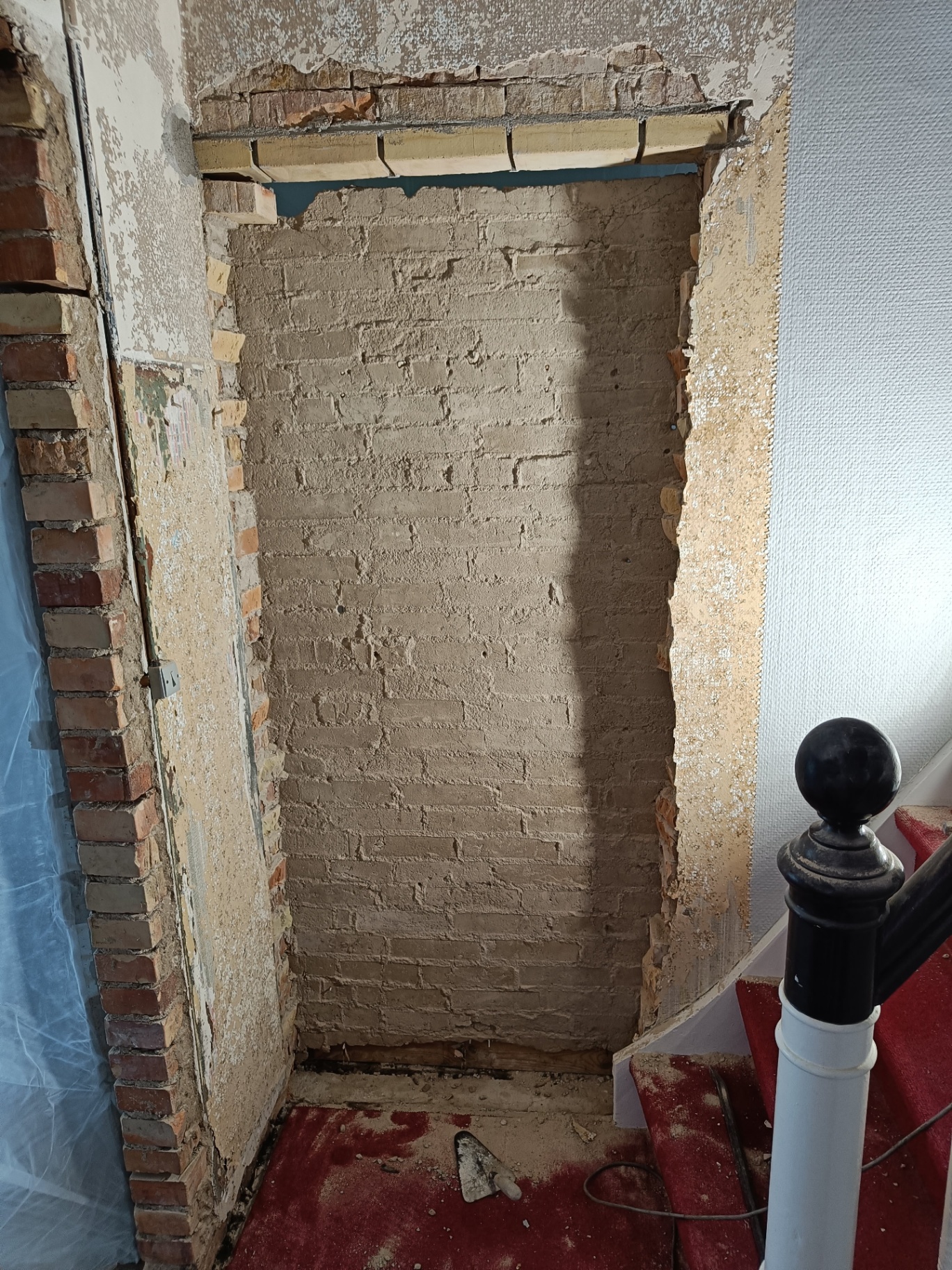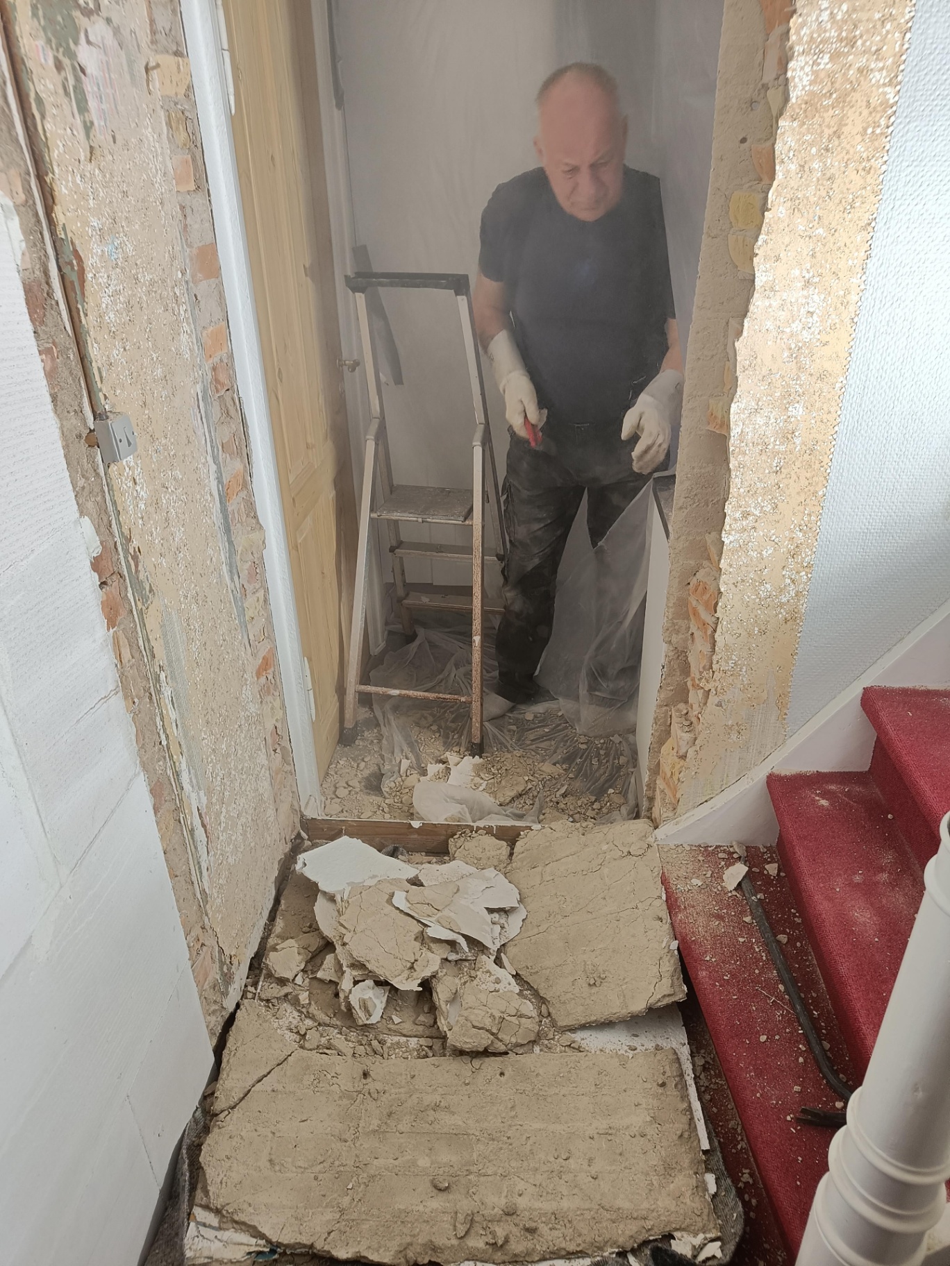 Da vi købte huset gik man igennem entreen og kom direkte ind i sofastuen, vi valgte at mure døren op her og åbne ind til køkkenet i stedet for. Vi fik sat gasbeton op og sammen med Frank og hans kammerat fik vi muret den op, og sat ståltegl over åbningen til køkkenet.