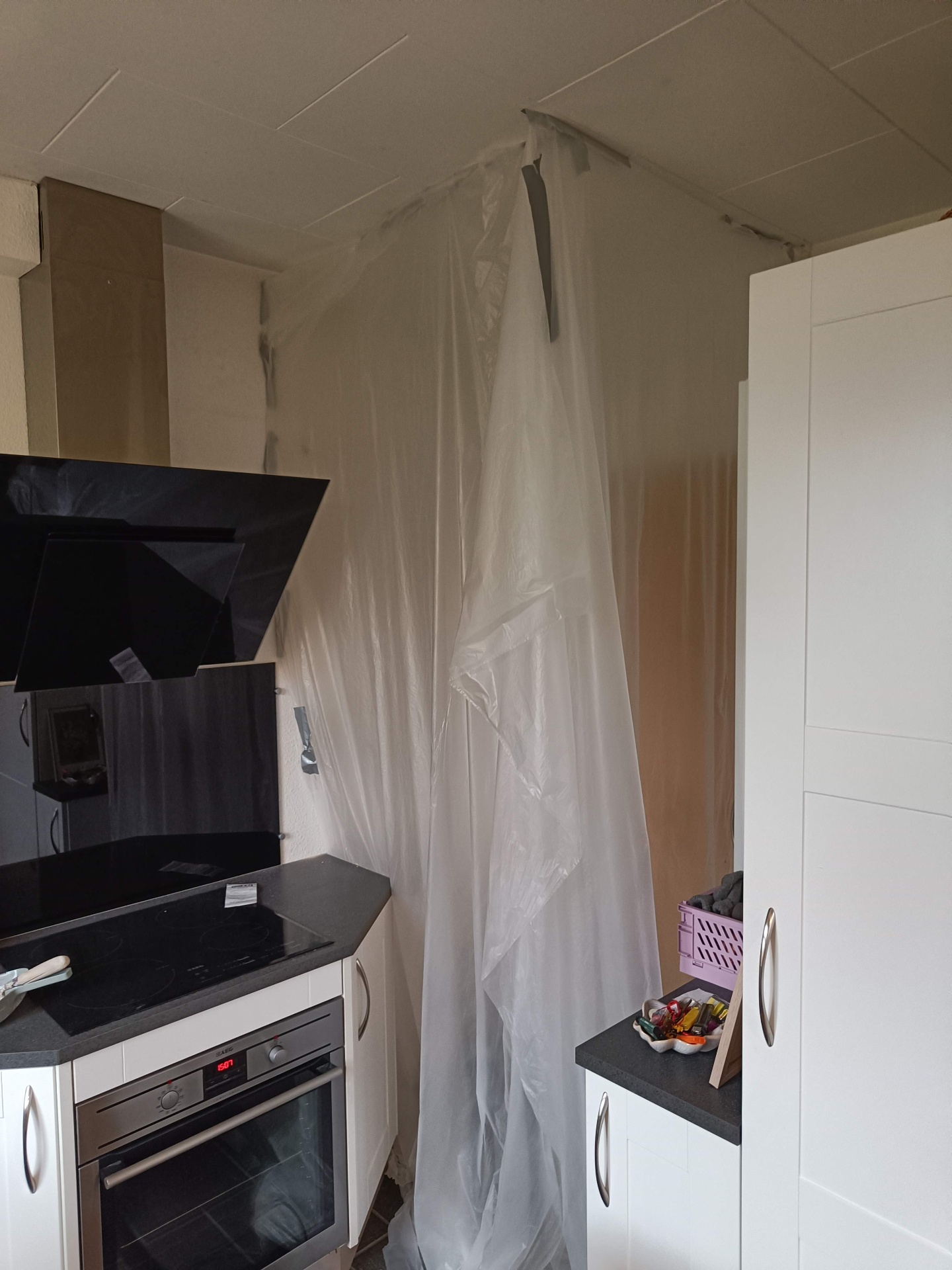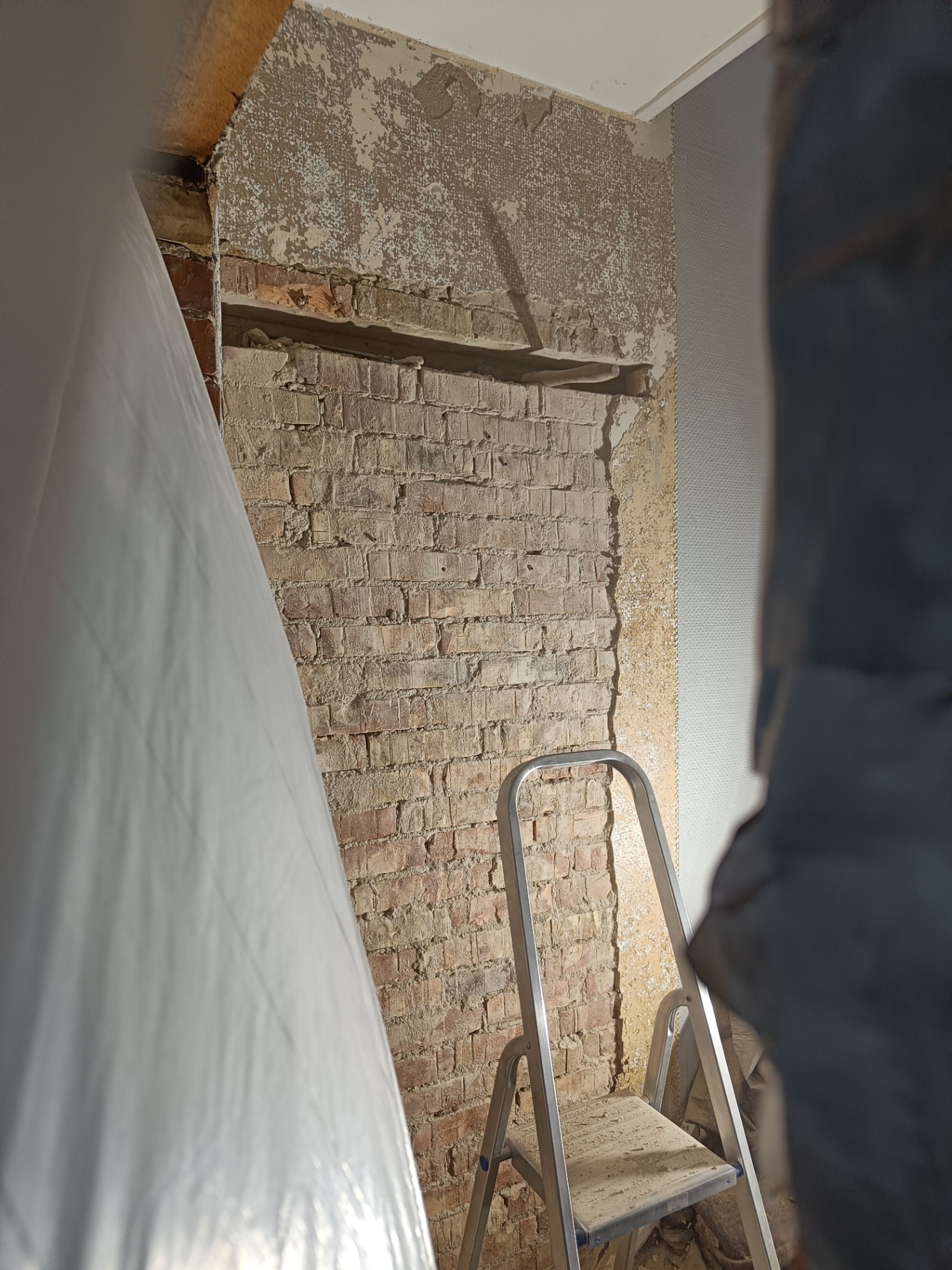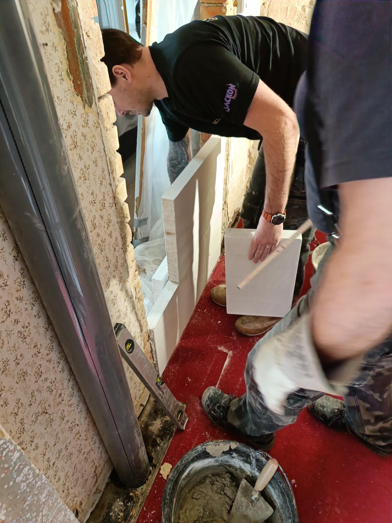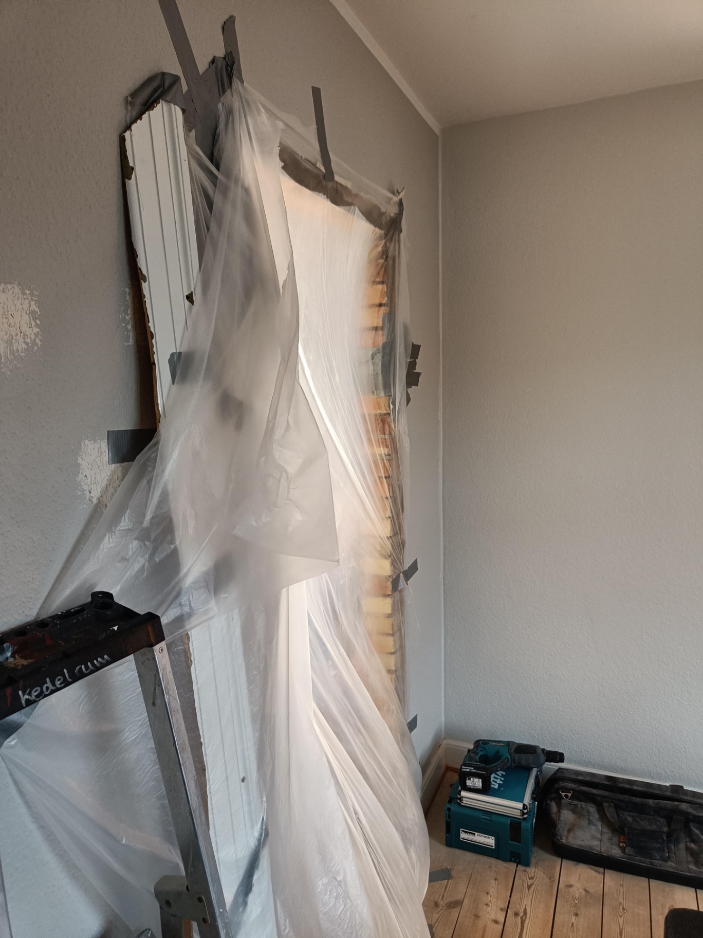Da vi købte huset gik man igennem entreen og kom direkte ind i sofastuen, vi valgte at mure døren op her og åbne ind til køkkenet i stedet for. Vi fik sat gasbeton op og sammen med Frank og hans kammerat fik vi muret den op, og sat ståltegl over åbningen til køkkenet.