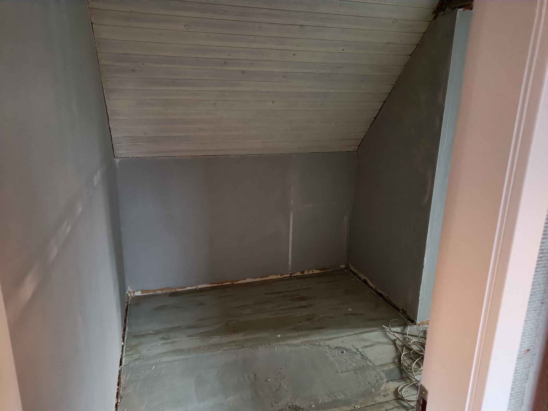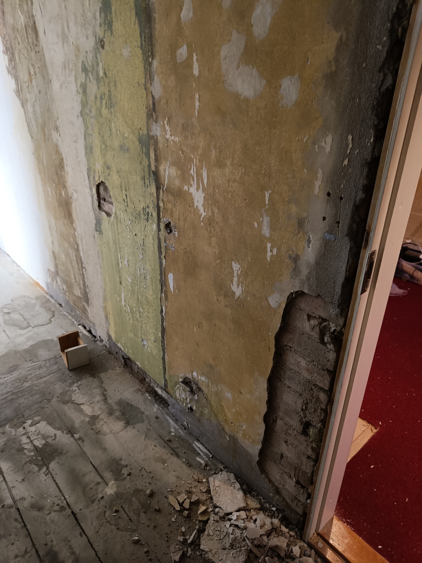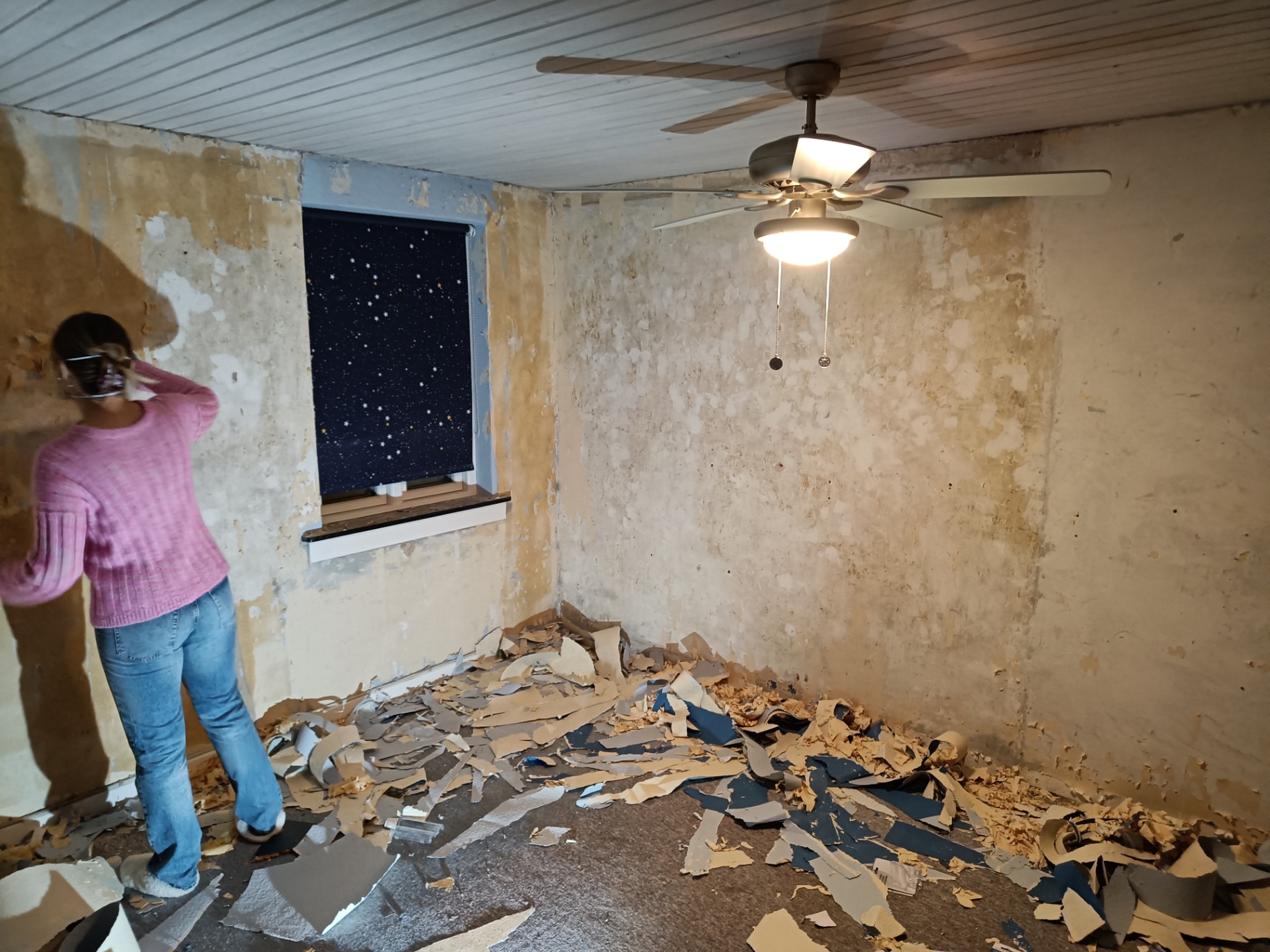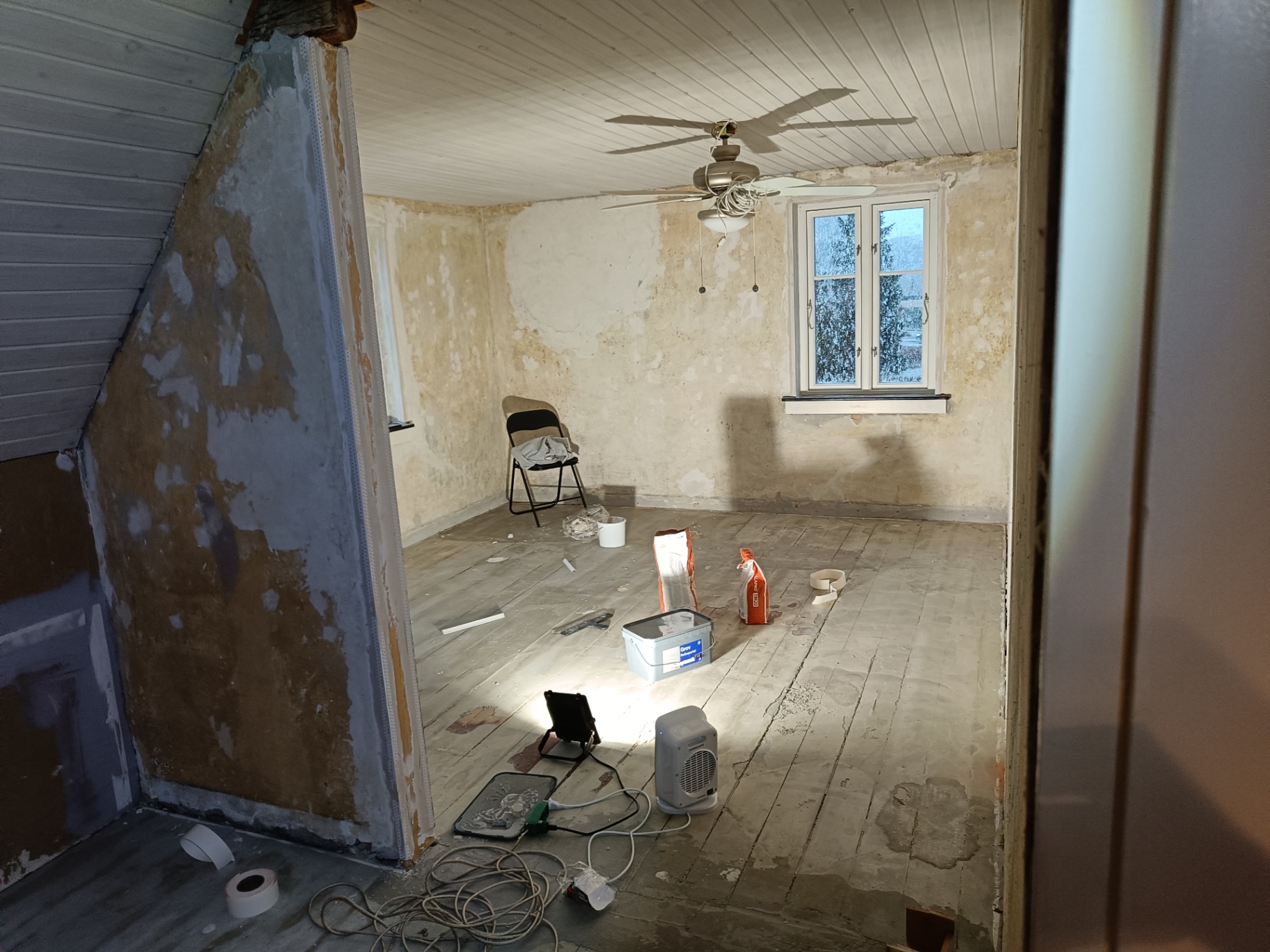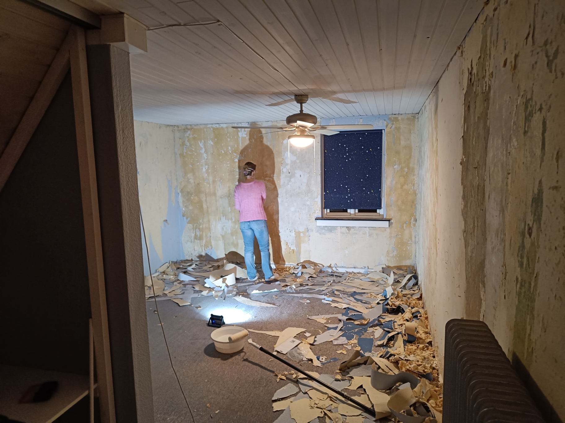 Her har vi fjernet alt det gamle tapet, fjernet gulvtæpper, fodlister og loftslister Det var et kæmpe skrabearbejde at få skrabet alt det gamle tapet ned, der blev brugt en masse tapet opløser. Vi skulle have tapetet af så vi kunne få et firma til at komme og spartle og lægge filt på.