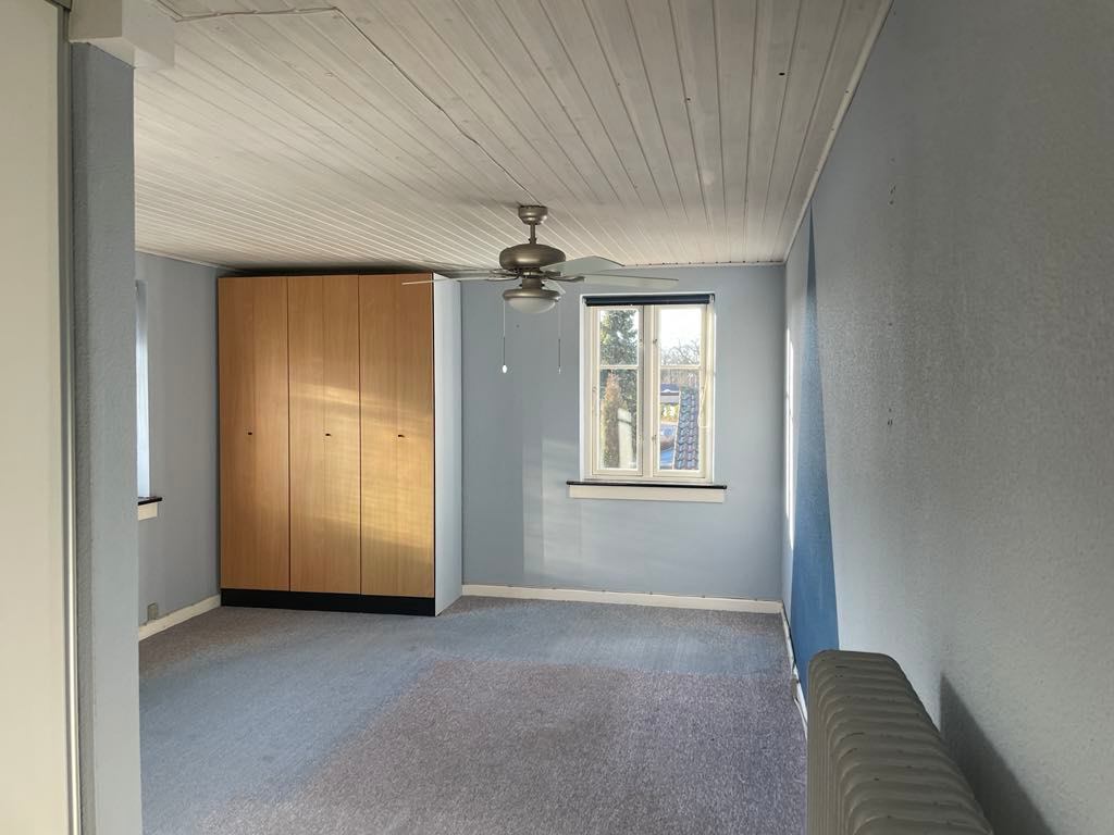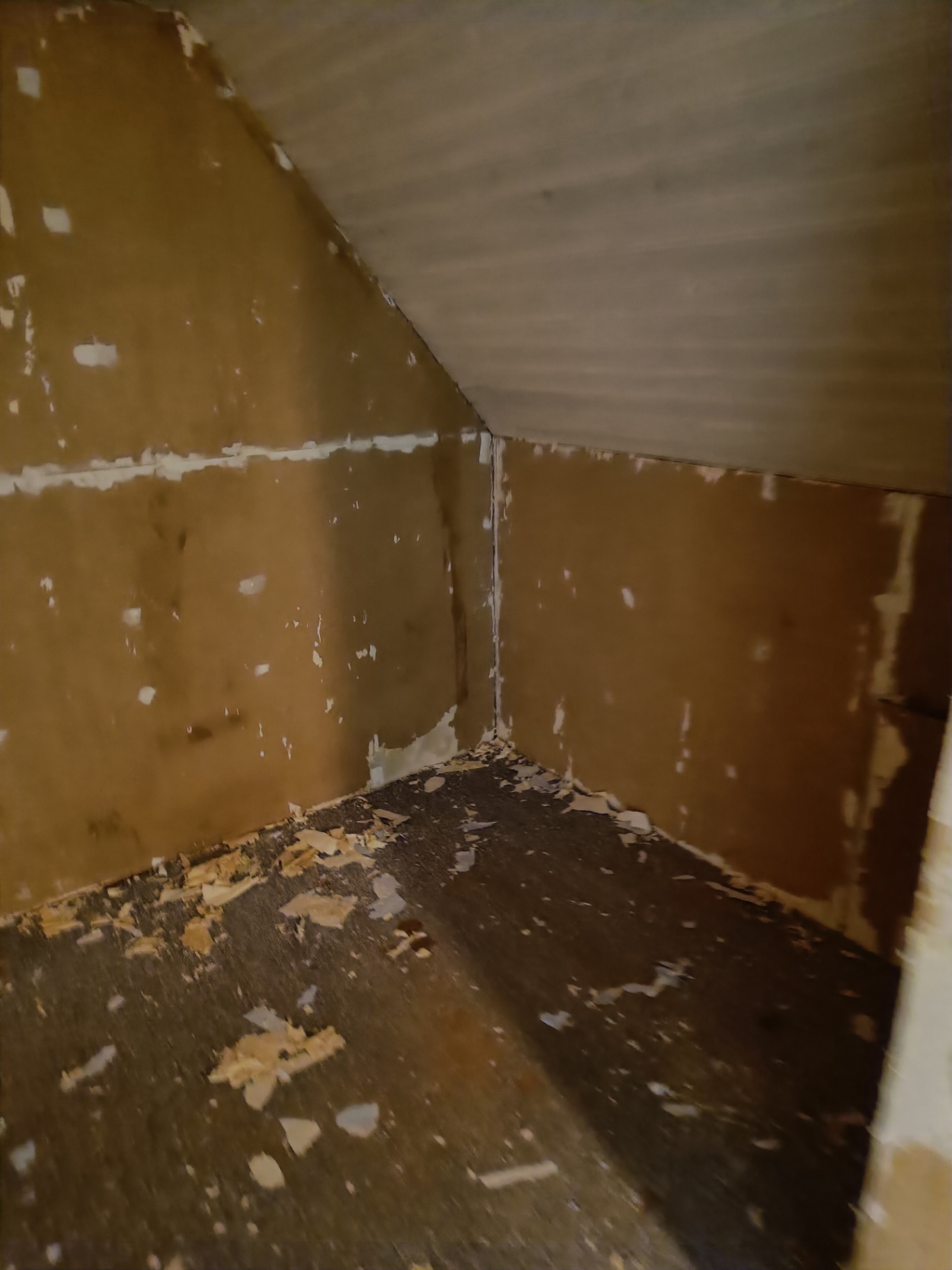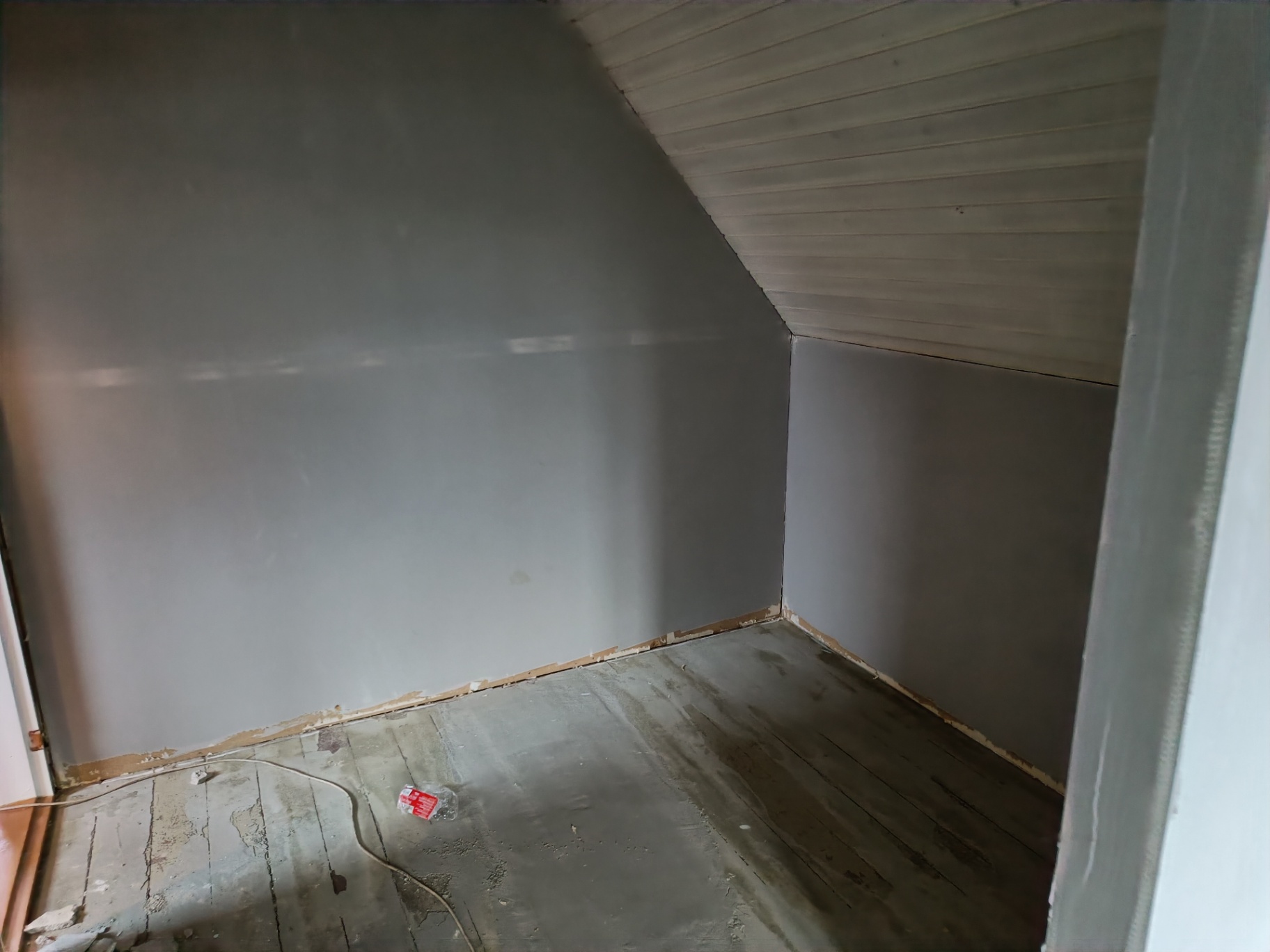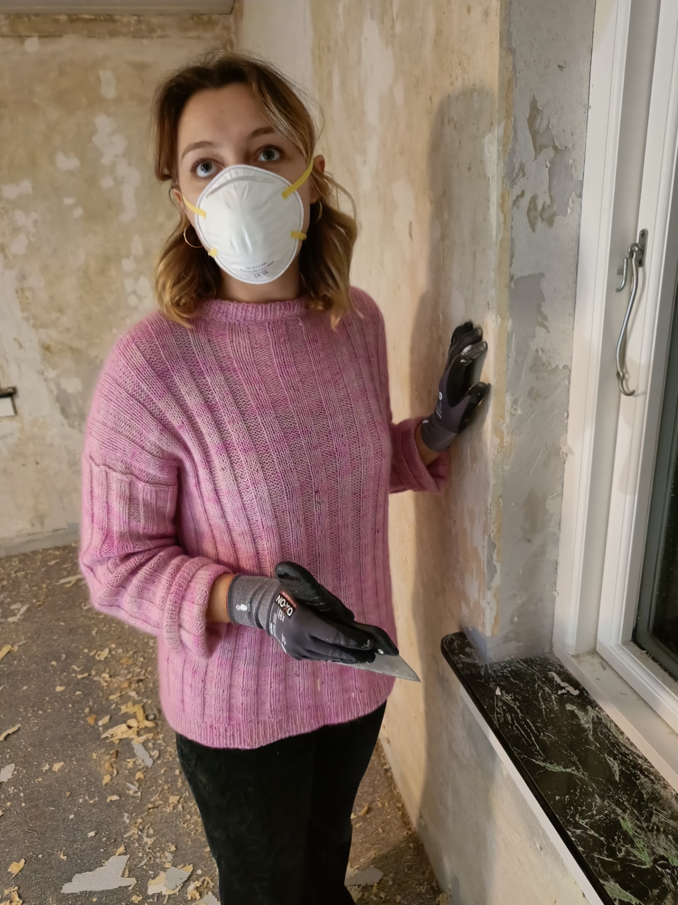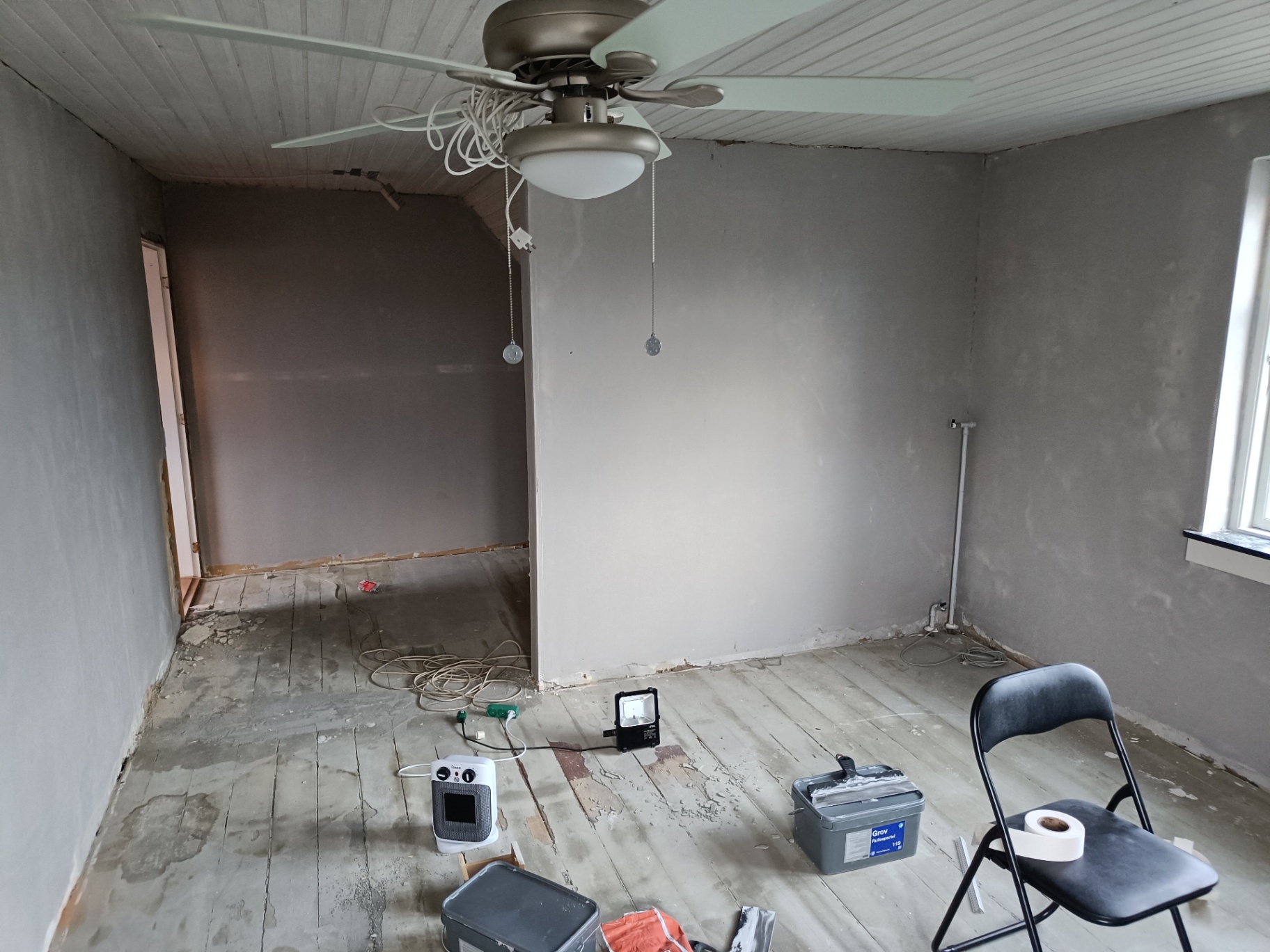 Her har vi fjernet alt det gamle tapet, fjernet gulvtæpper, fodlister og loftslister Det var et kæmpe skrabearbejde at få skrabet alt det gamle tapet ned, der blev brugt en masse tapet opløser. Vi skulle have tapetet af så vi kunne få et firma til at komme og spartle og lægge filt på.
