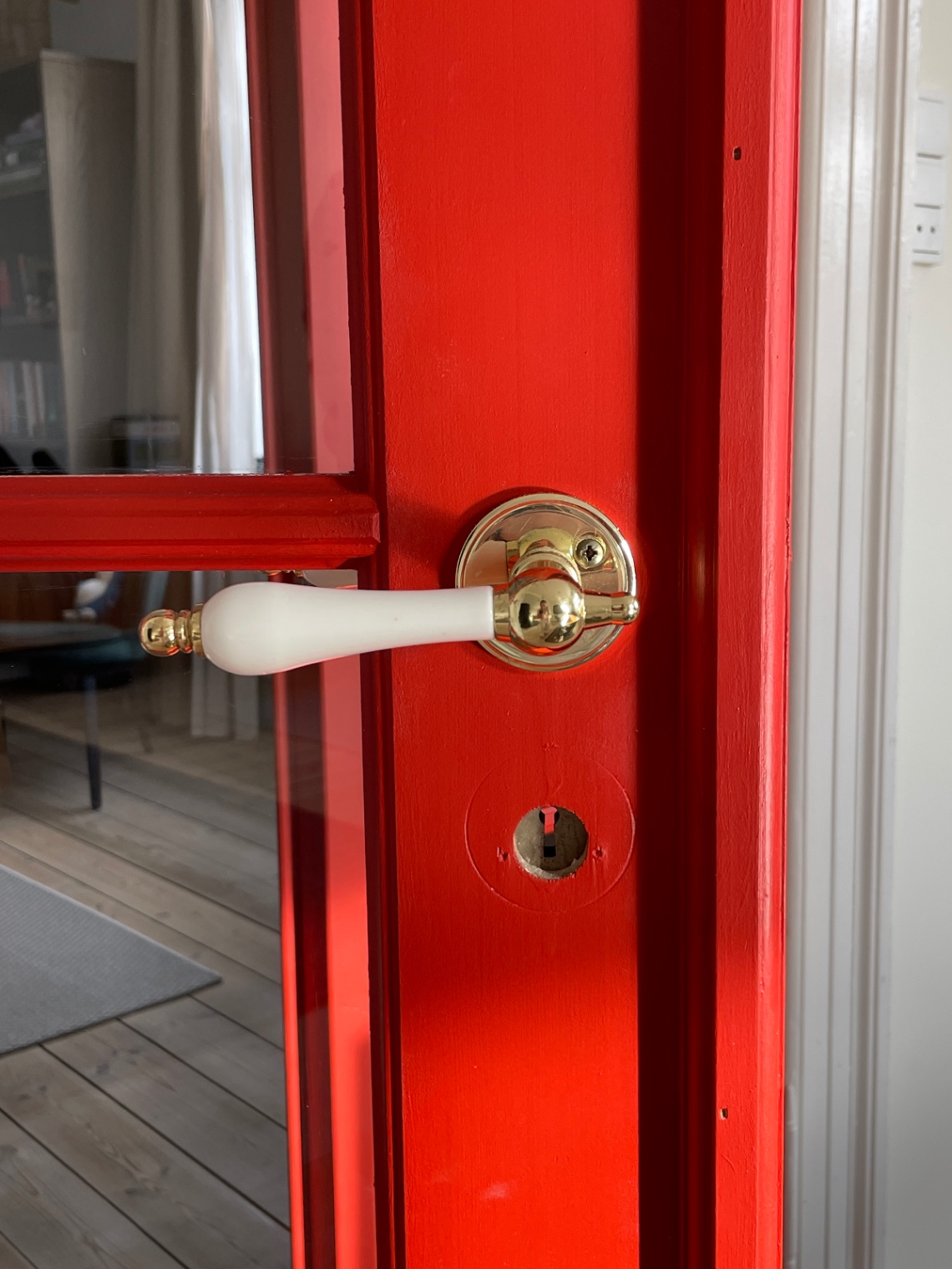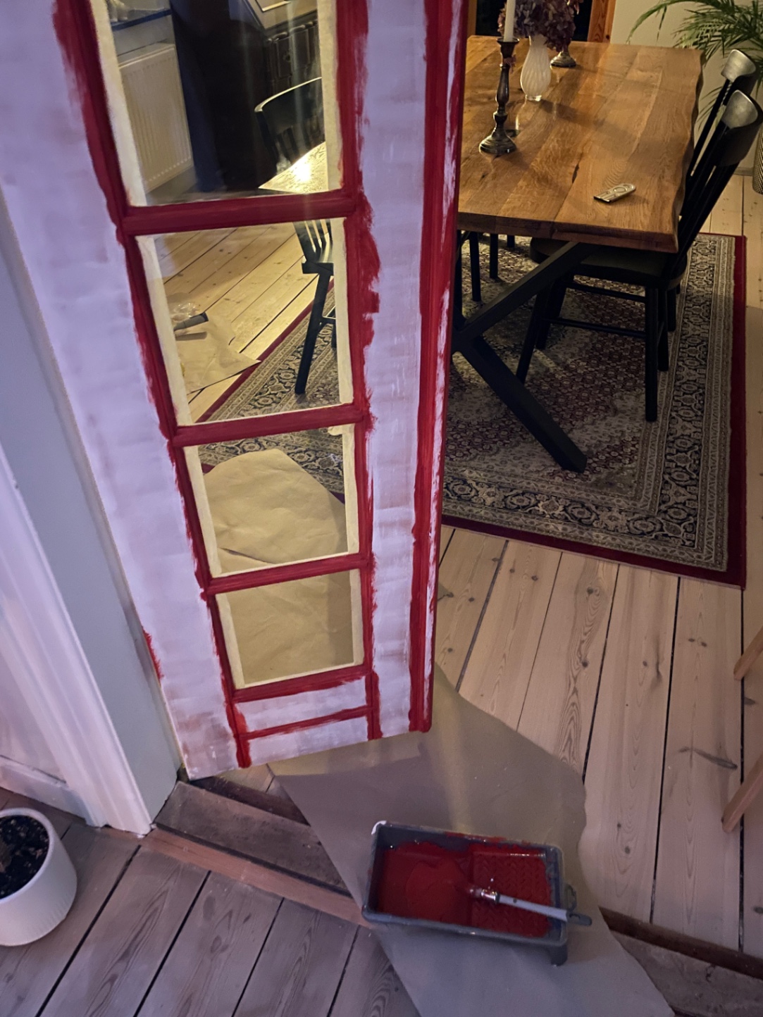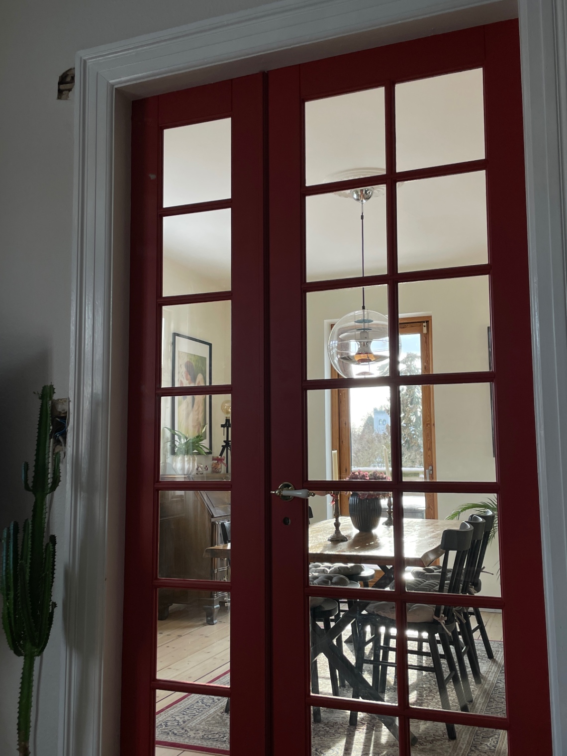 Vores lakerede, sprossede dobbeltdør mellem stue og spistestue trængte til en opdatering. Så vi besluttede at slibe den, for at derefter grunde og male med en flot rød træfarve. Det tog længere tid end man lige skulle tro, men det pynter!