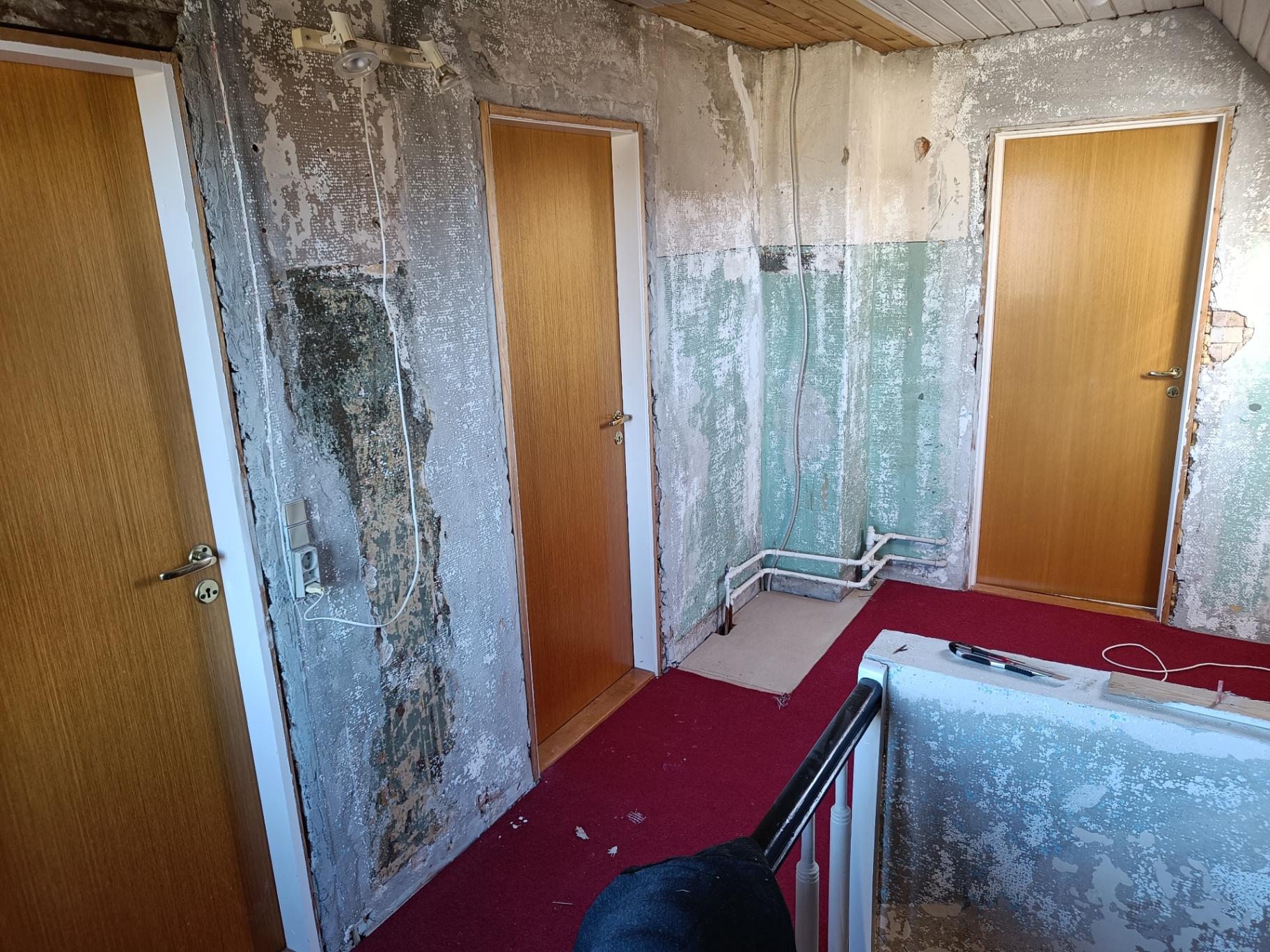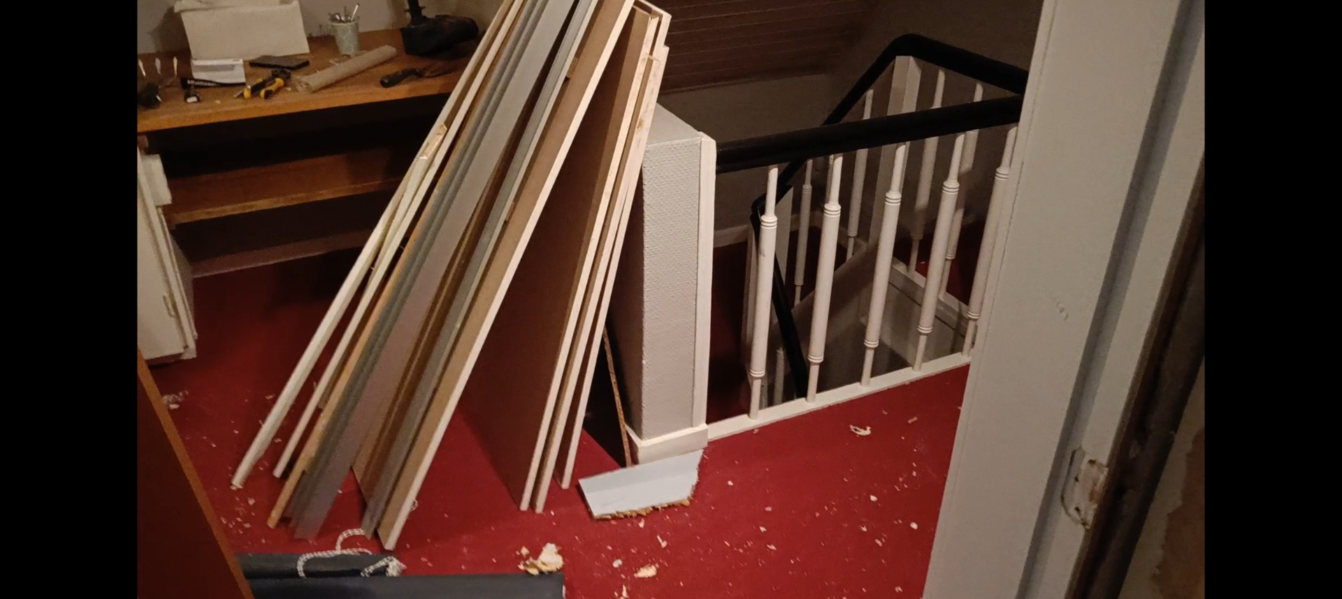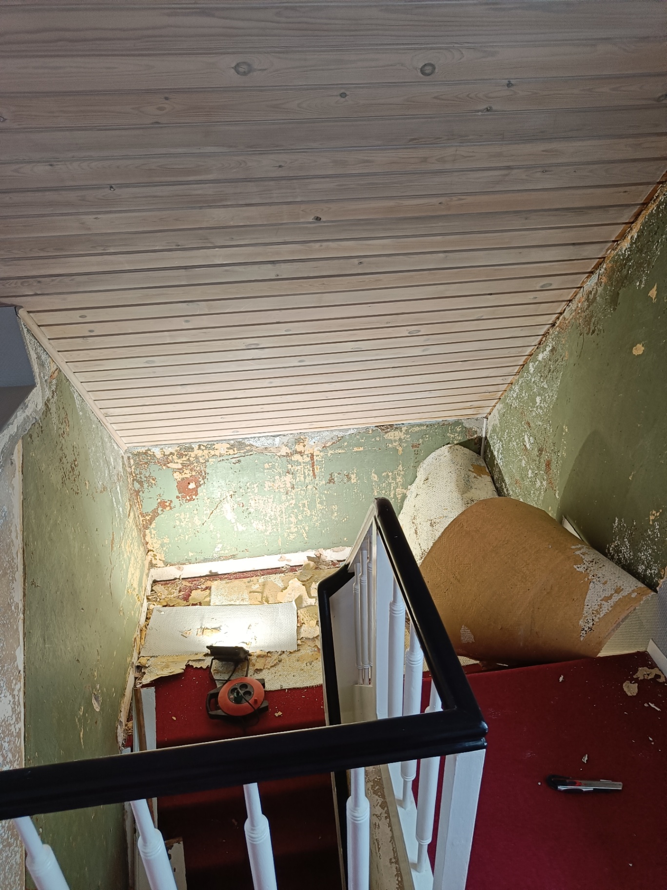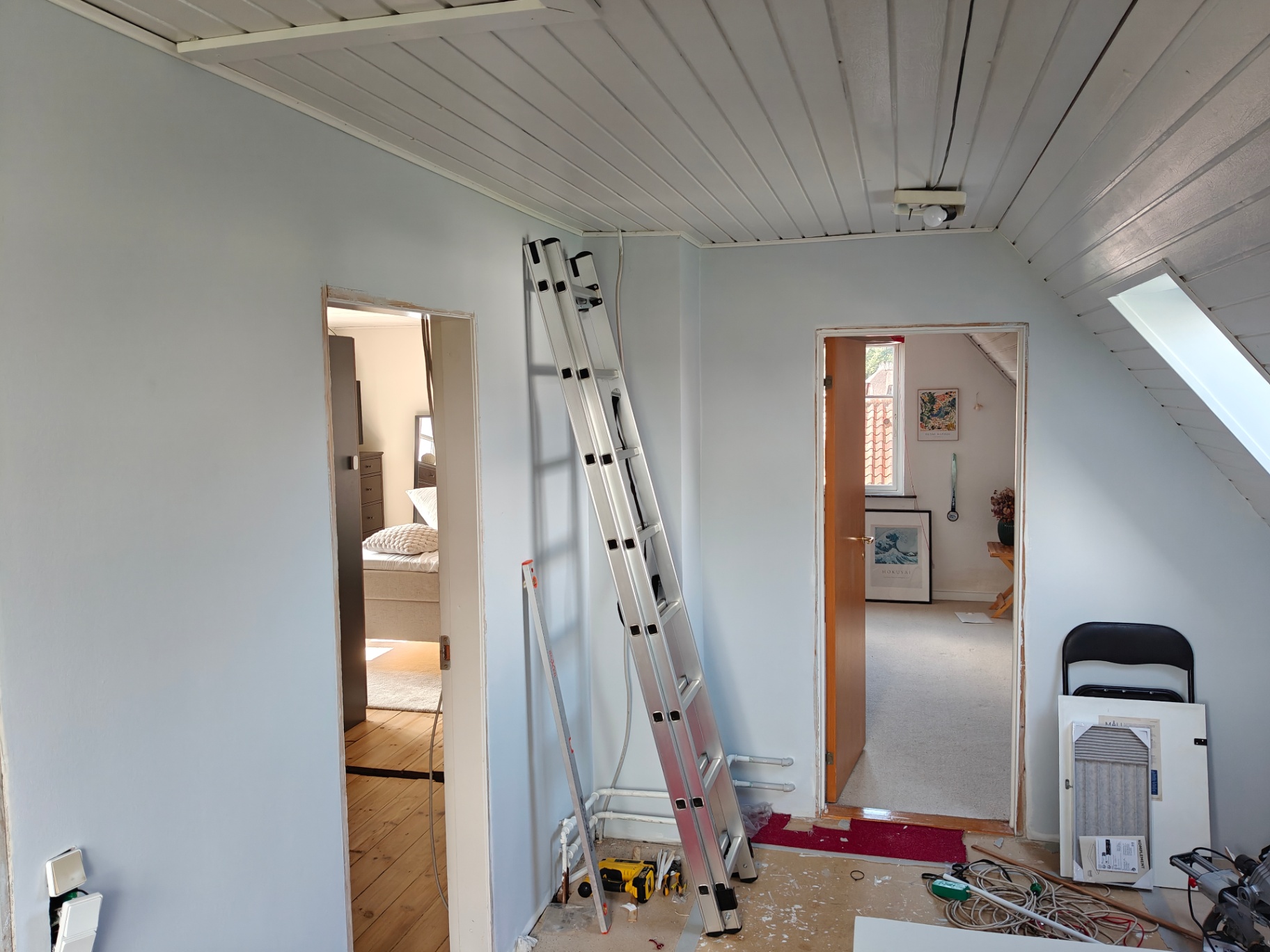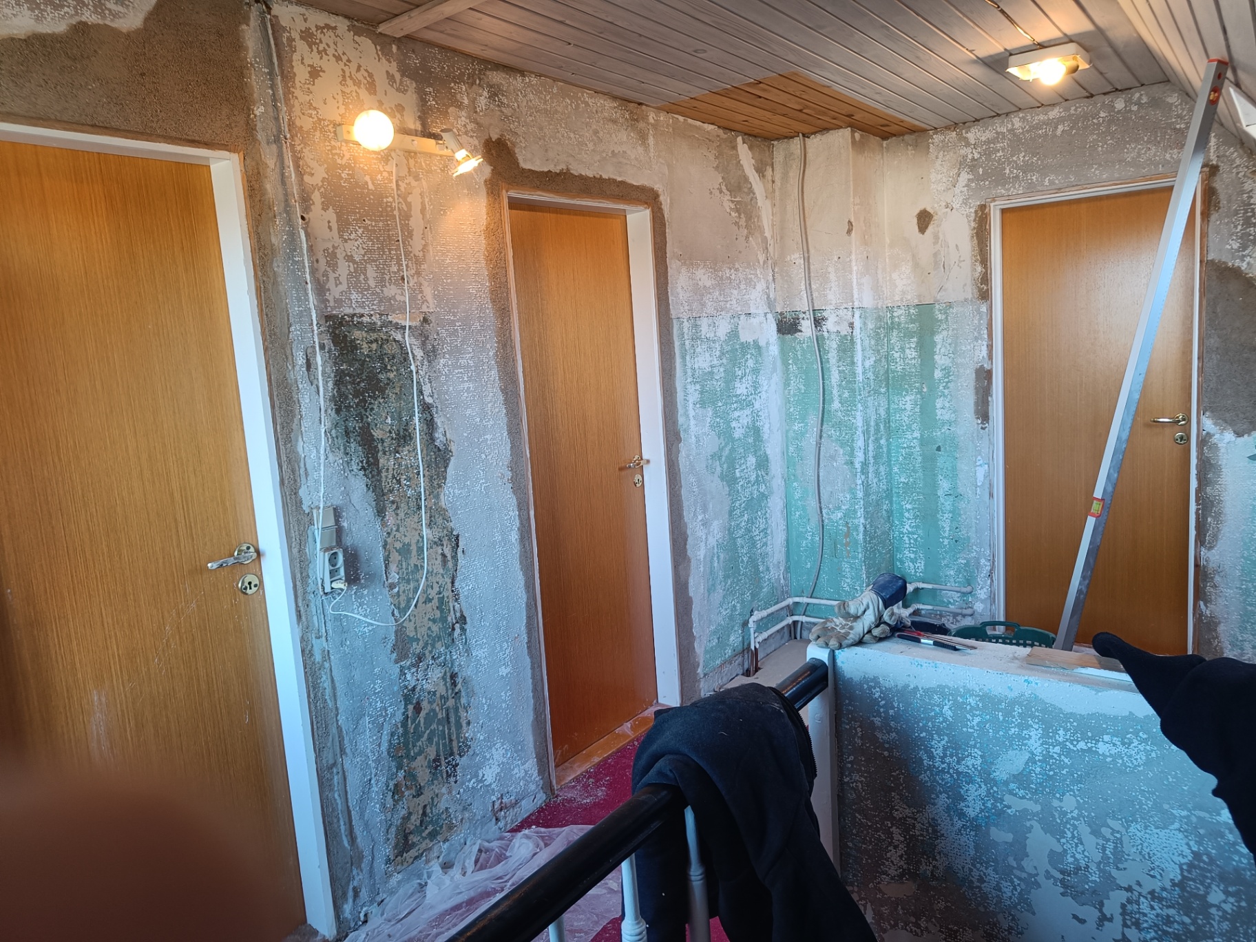 Her på "Første etage mellemgang" fik vi fjernet tæpper, gerigter, fodlister, loftslister, samt en masse gamle skabe. Efter gerigterne kom af væggene, skulle der mørtles op igen da pudsen var gået løs. Igen havde Frank hjulpet med lidt el løsning, vi fik kørt en ny ledning igennem muren og sat stikkontakt i væggen.
