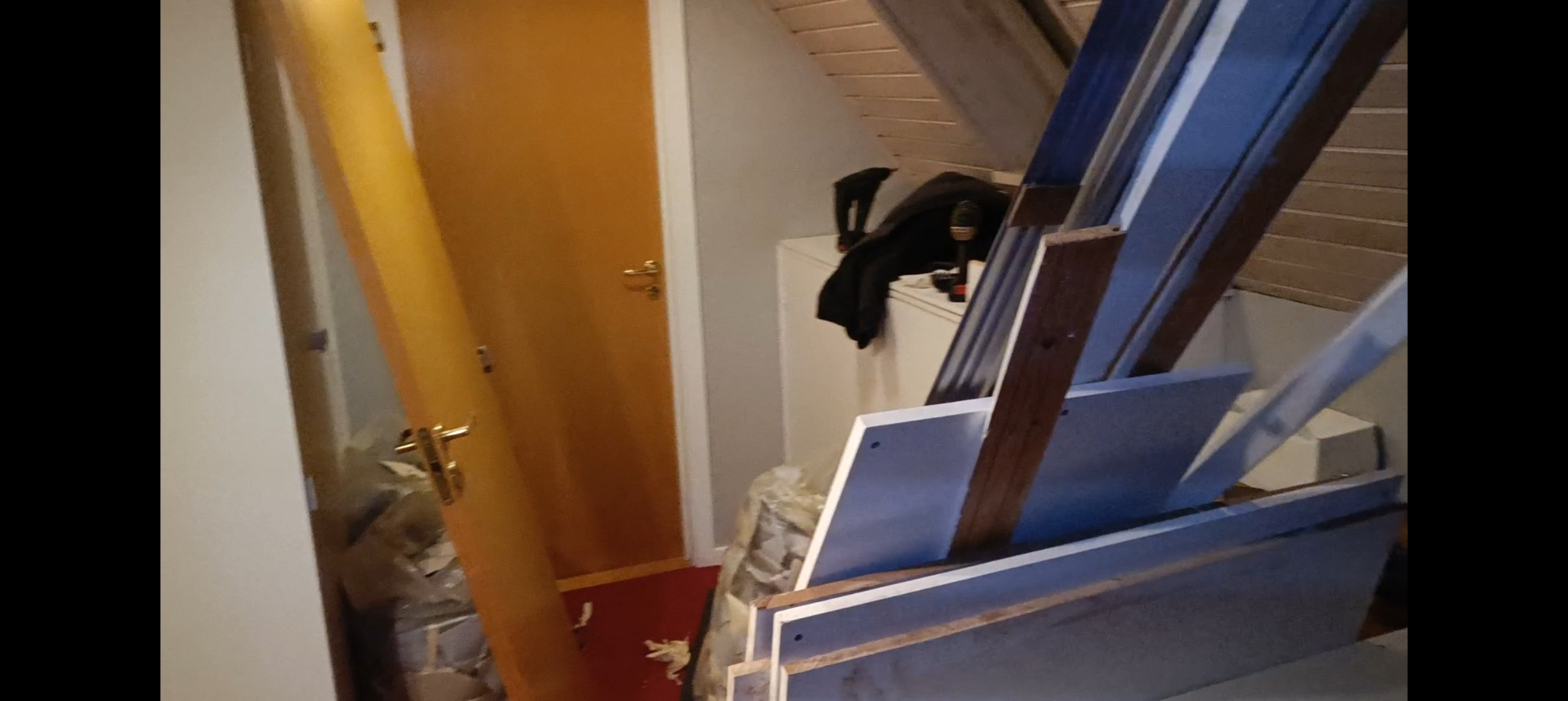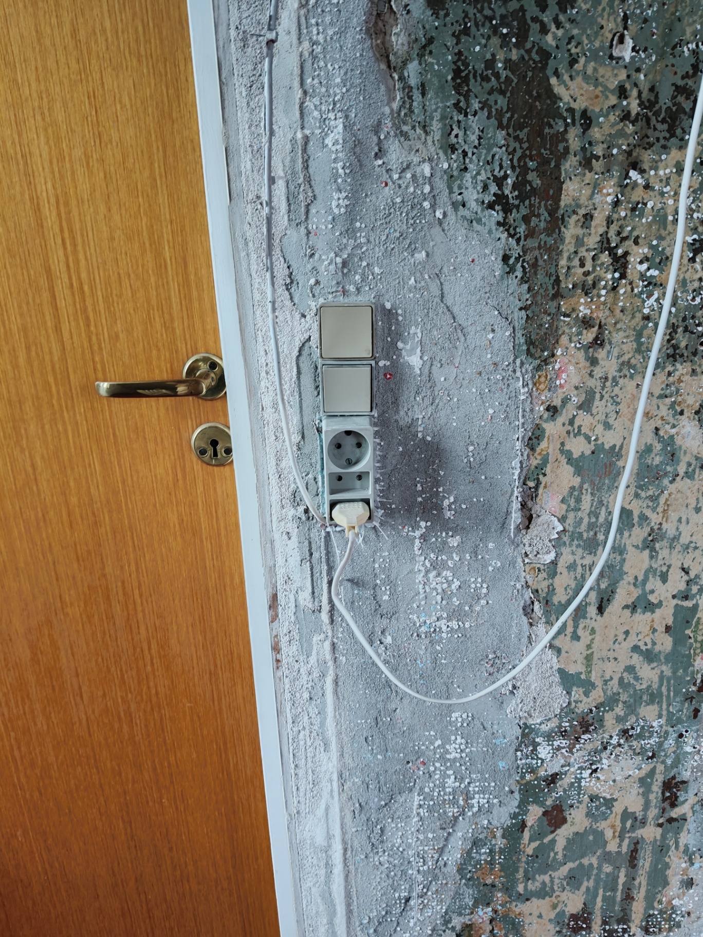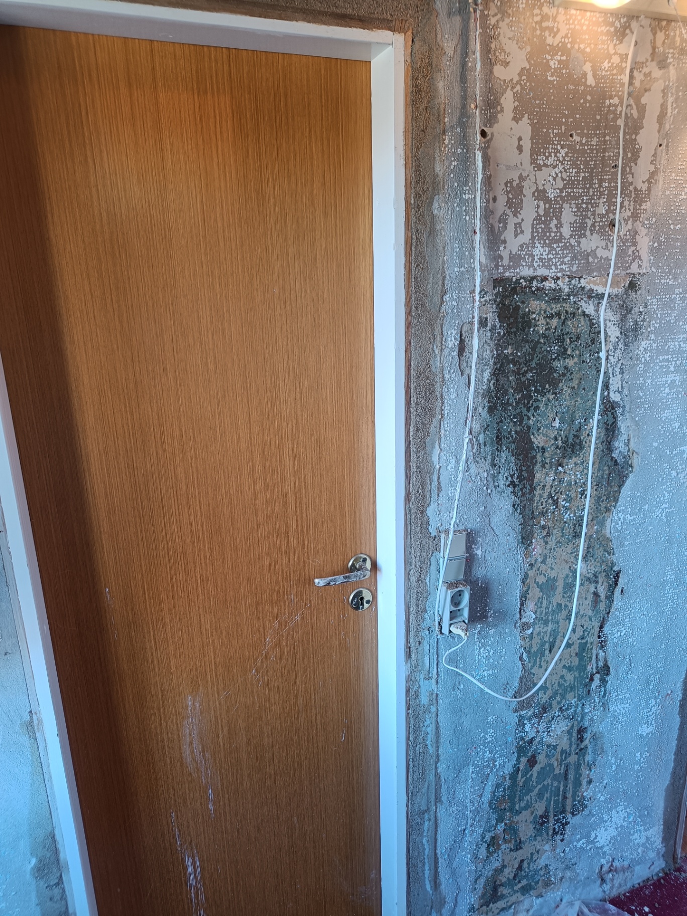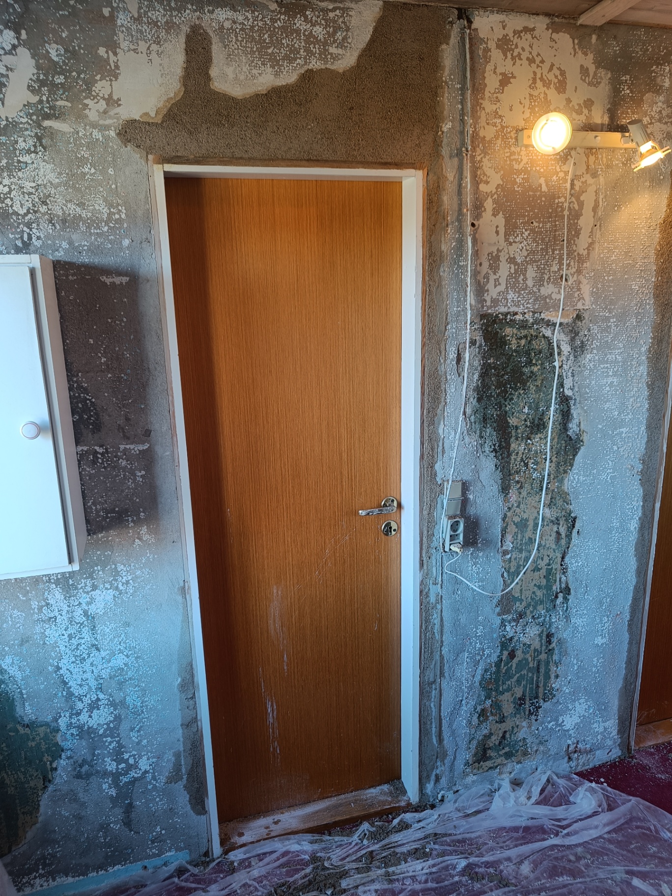 Her på "Første etage mellemgang" fik vi fjernet tæpper, gerigter, fodlister, loftslister, samt en masse gamle skabe. Efter gerigterne kom af væggene, skulle der mørtles op igen da pudsen var gået løs. Igen havde Frank hjulpet med lidt el løsning, vi fik kørt en ny ledning igennem muren og sat stikkontakt i væggen.