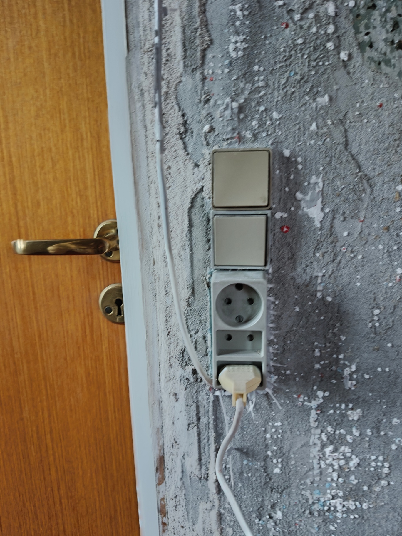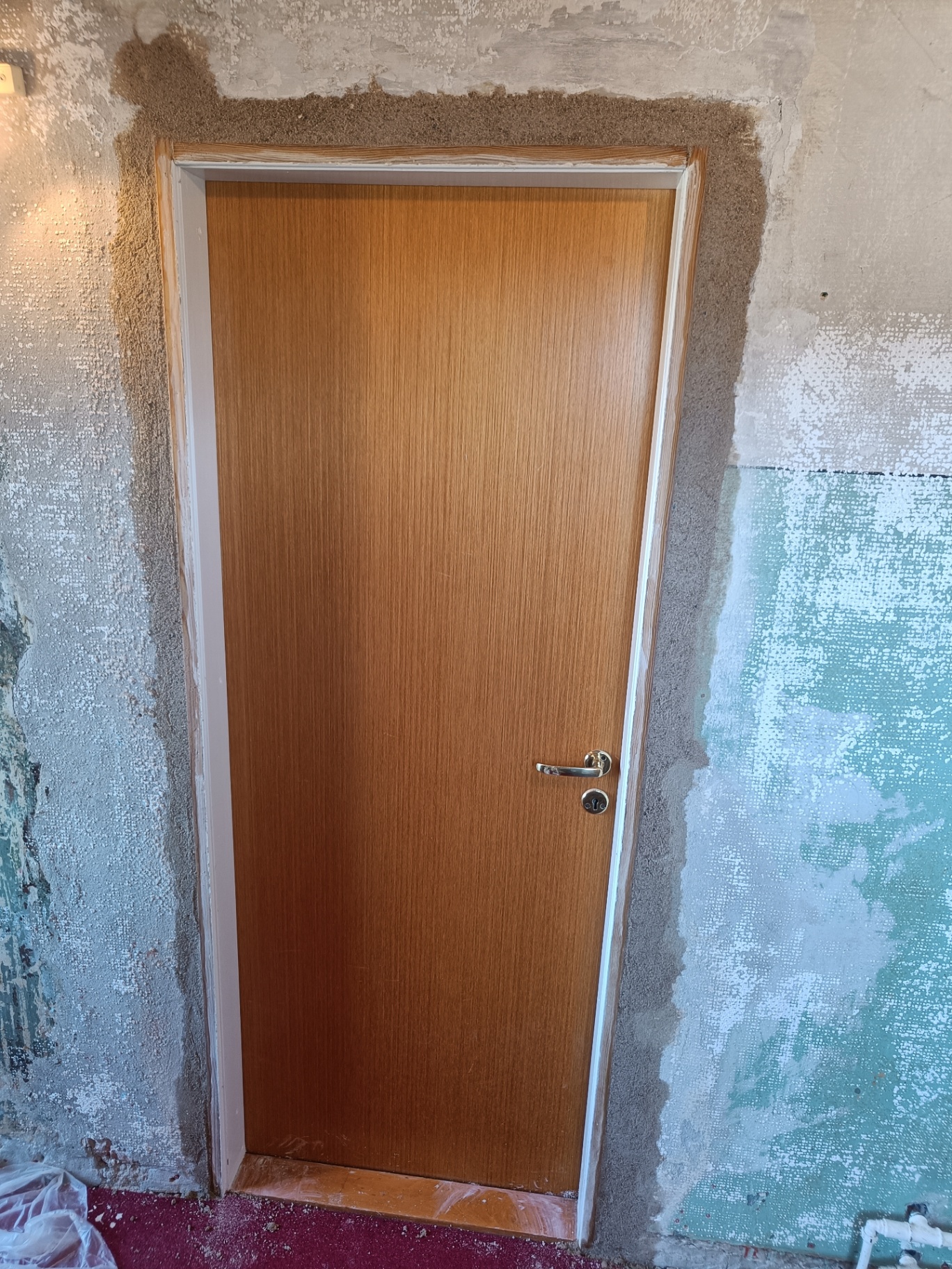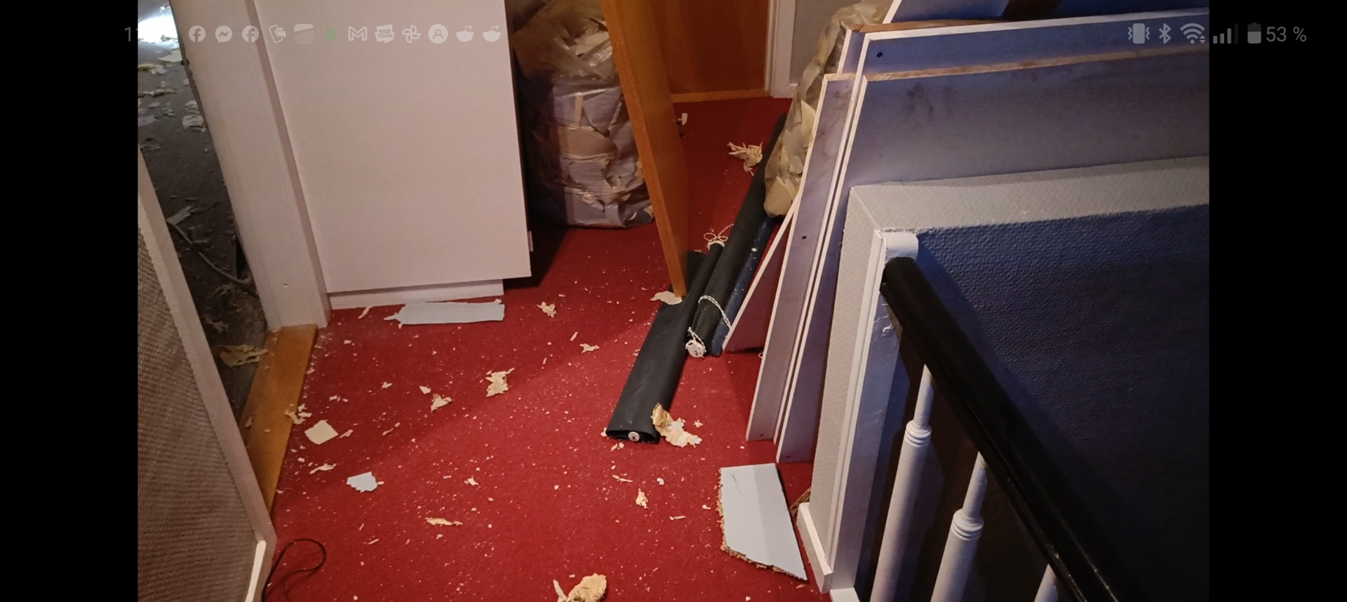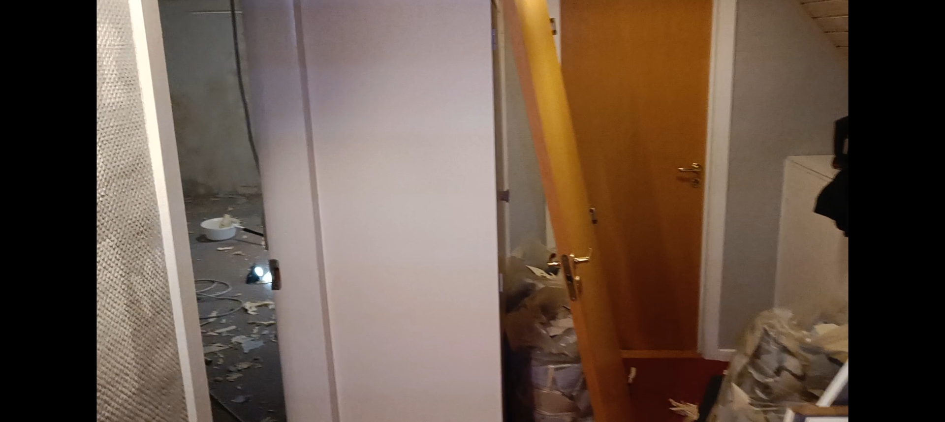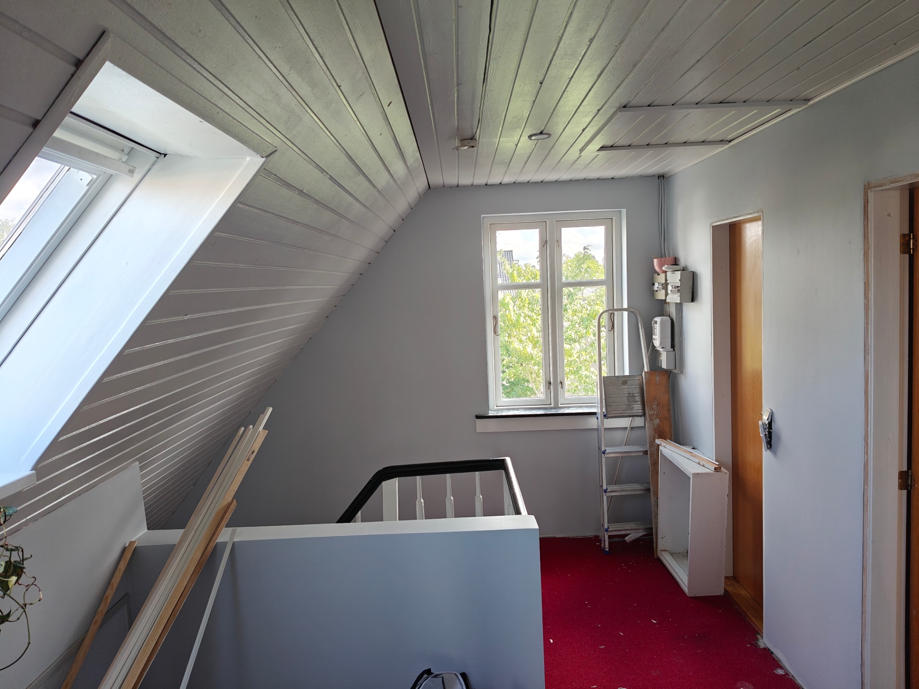 Her på "Første etage mellemgang" fik vi fjernet tæpper, gerigter, fodlister, loftslister, samt en masse gamle skabe. Efter gerigterne kom af væggene, skulle der mørtles op igen da pudsen var gået løs. Igen havde Frank hjulpet med lidt el løsning, vi fik kørt en ny ledning igennem muren og sat stikkontakt i væggen.